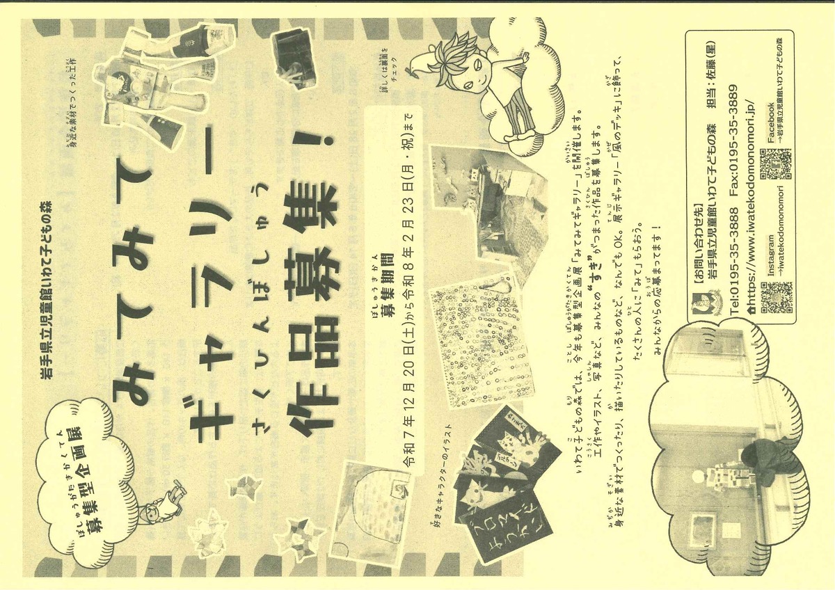 岩手県立児童館いわて子どもの森から、募集型企画展【みてみてギャラリー】作品募集のご案内をいただきました。あなたも作品を応募してみませんか。詳しくはチラシをご覧ください。