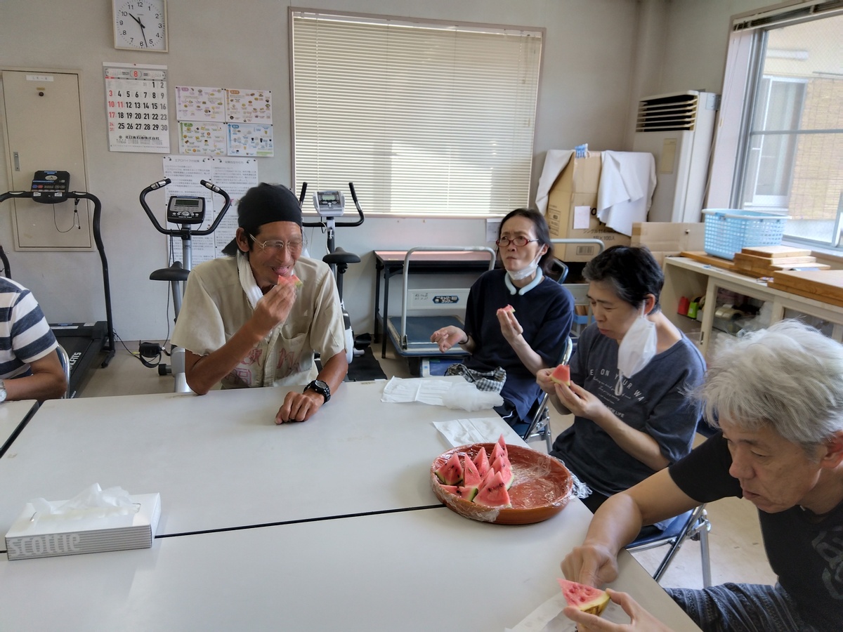 好地荘の畑では、様々な野菜や花を育てており、受託作業グループに所属している利用者、職員を中心に日々草取りや水やりを行っています。遂に今月、スイカ、ミニトマト、カボチャが実り、収穫の時期を迎えました。 スイカとミニトマトは作業を終えた後にみんなで食べ、「美味しい」「甘い」などの声が聞かれました。