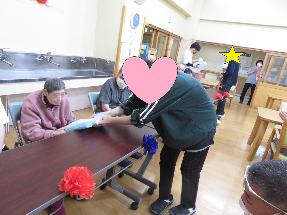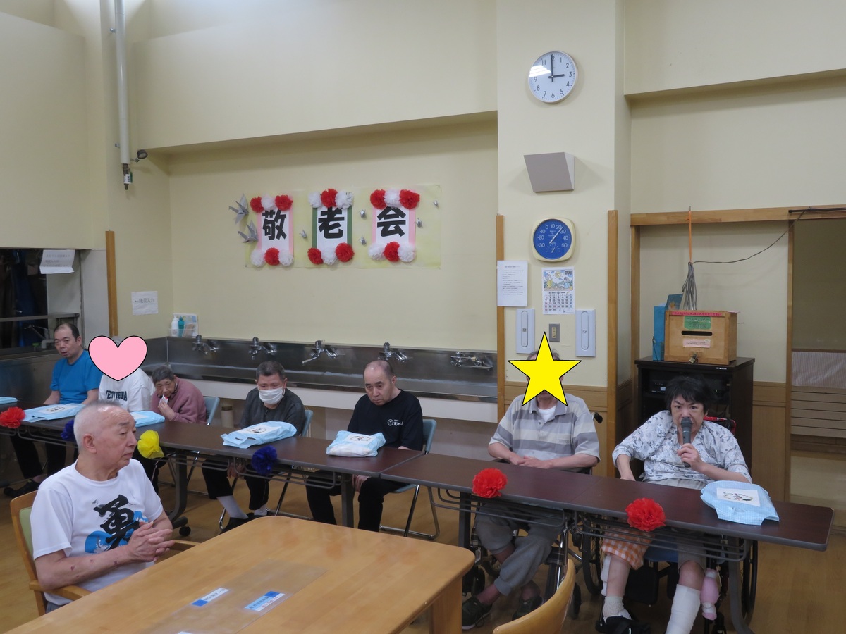松山荘では、『敬老を祝う会』を開催しました。 今年は、還暦(60歳:4名)、古希(70歳:2名)、傘寿(80歳:1名)の方が対象でした。会の中では、自治会長よりお祝いの言葉やお祝いの記念品の贈呈がありました。また、対象利用者の代表者からお礼の言葉もありました。そして、会食も行われ、皆さんで対象利用者の方々の長寿と健康をお祝いしています。