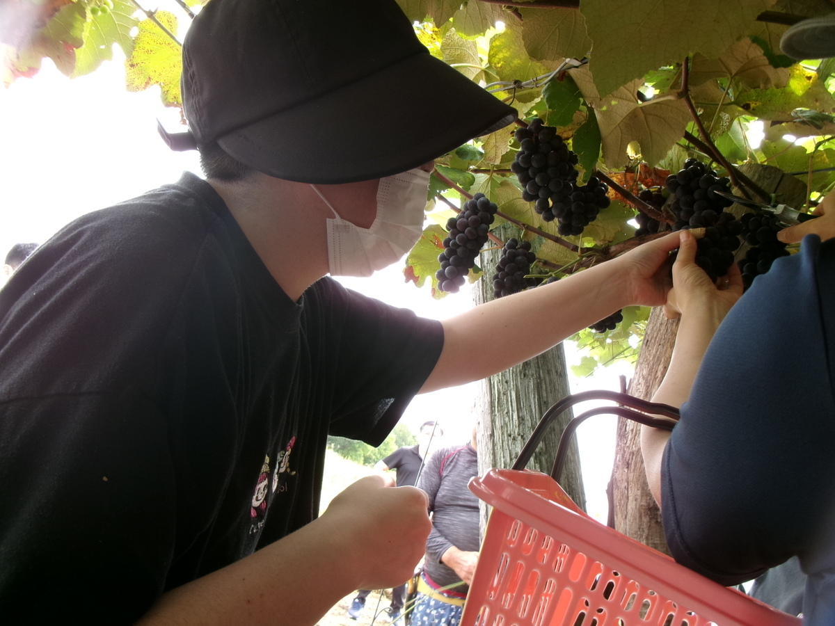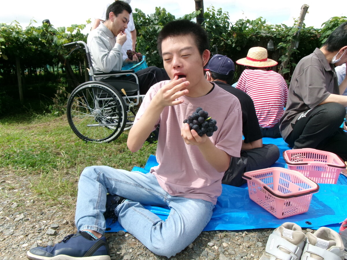 暑かった夏から秋を感じ始めた9月中旬。生活介護では、利用者さんのご家族のぶどう畑へぶどう狩りに行って来ました。皆さん、どれもおいしそうなぶどうでしたが、よりおいしそうなぶどうを見定めて収穫していました。取れたてのぶどうのお味は格別で、次々と口に運んでいました。天気も晴れ、気持ちの良いぶどう狩り日和となりました。