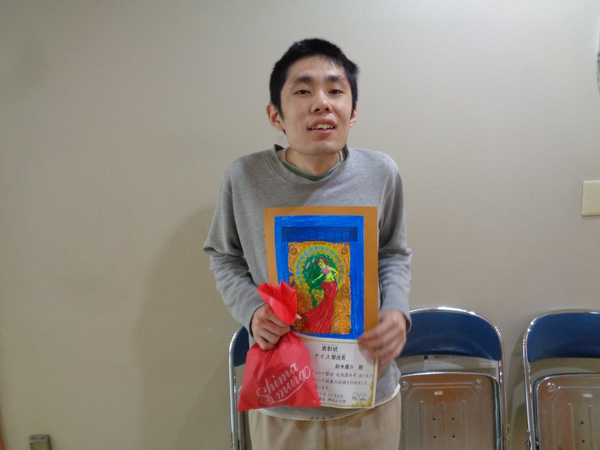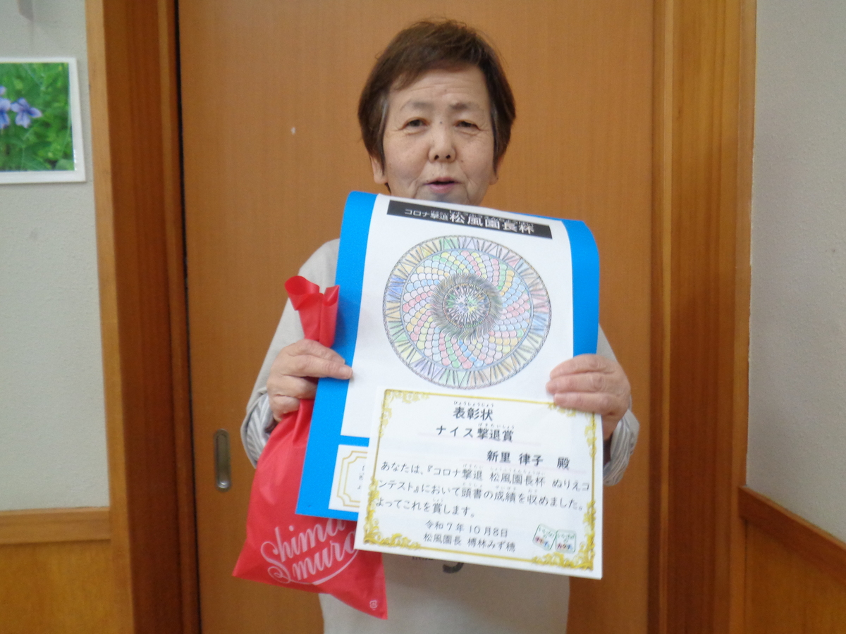 松風園でコロナクラスターが発生し、療養期間中「コロナ撃退 松風園園長杯」の塗り絵コンテストが開催されました。皆さん思い思いに祈祷を込め描いて頂きました。「ナイス撃退賞」として5名の方が園長から表彰され、副賞と共に記念撮影をしました。 松風園で発生したコロナは、皆さんの強い願いによって、退散していったのです。