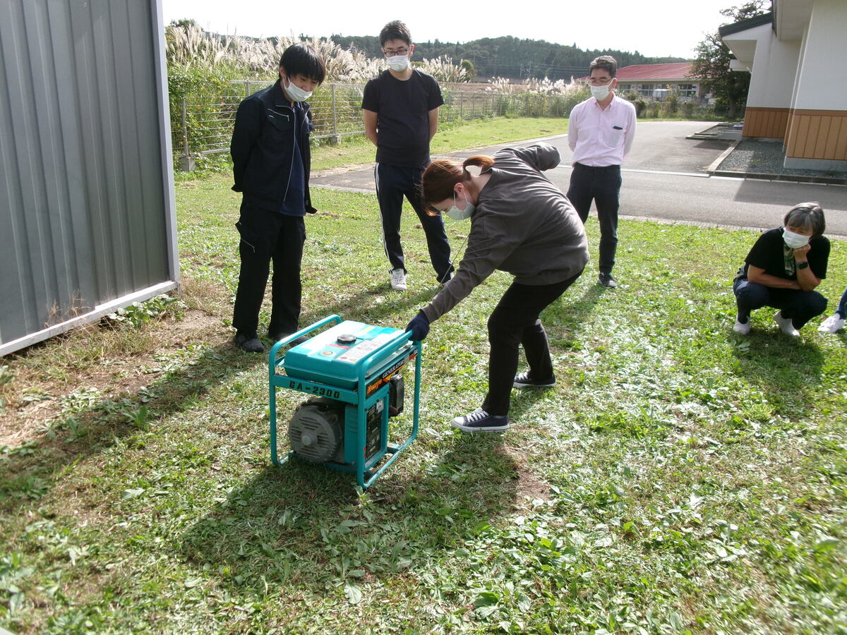 災害時、厨房が使用できない事を想定して炊き出し訓練を行いました。まずは防災係から発電機の使用方法を学び、実際に動かしてみました。