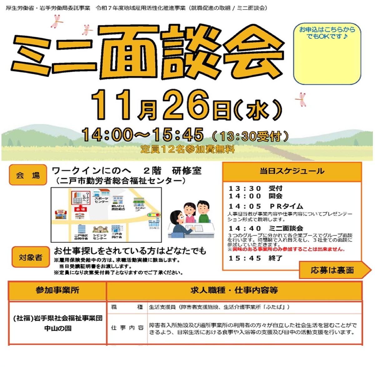 11月26日(水)14時から二戸地域雇用創造協議会が主催する「ミニ面談会」に中山の園が参加します。