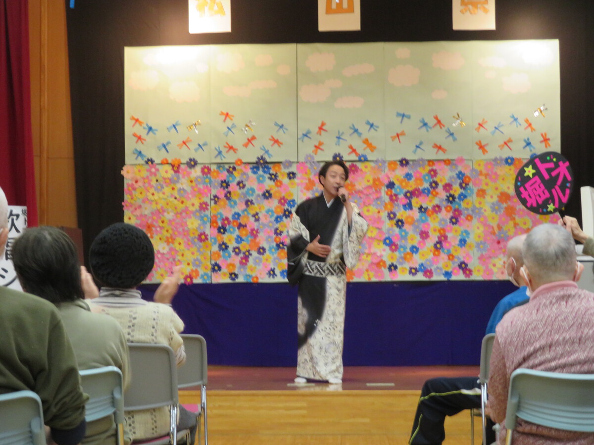 開催日当日は、地元の花輪小学校による獅子踊り・地元松山地区有志の皆様による演し物・利用者さんによるカラオケ・ミニゲーム(缶釣り競争)・くじ引き・お楽しみ景品抽選会そして宮古アビリティセンターさんを始め、地元のてんまる食堂さんやキッチンカー(焼き鳥・クレープ)による出張販売がありました。そして、今年は地元の演歌歌手をお招きしての歌謡ショーと盛りだくさんの内容となりました。また、当施設の会議室には、花輪保育所さん、花輪小学校さん、当施設の利用者さんが作成した様々な作品が展示されました。