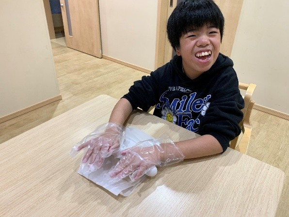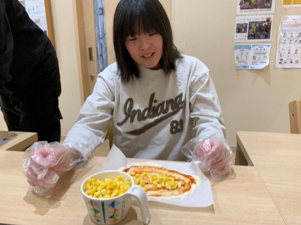 自治会でピザを作りたいという意見があったことから、夕方にピザ作りを行いました。栄養士に教えてもらいながら、生地を伸ばし、好きな具をトッピングしました。夕食で焼きたてを一人ずつ食べ、大満足でした!