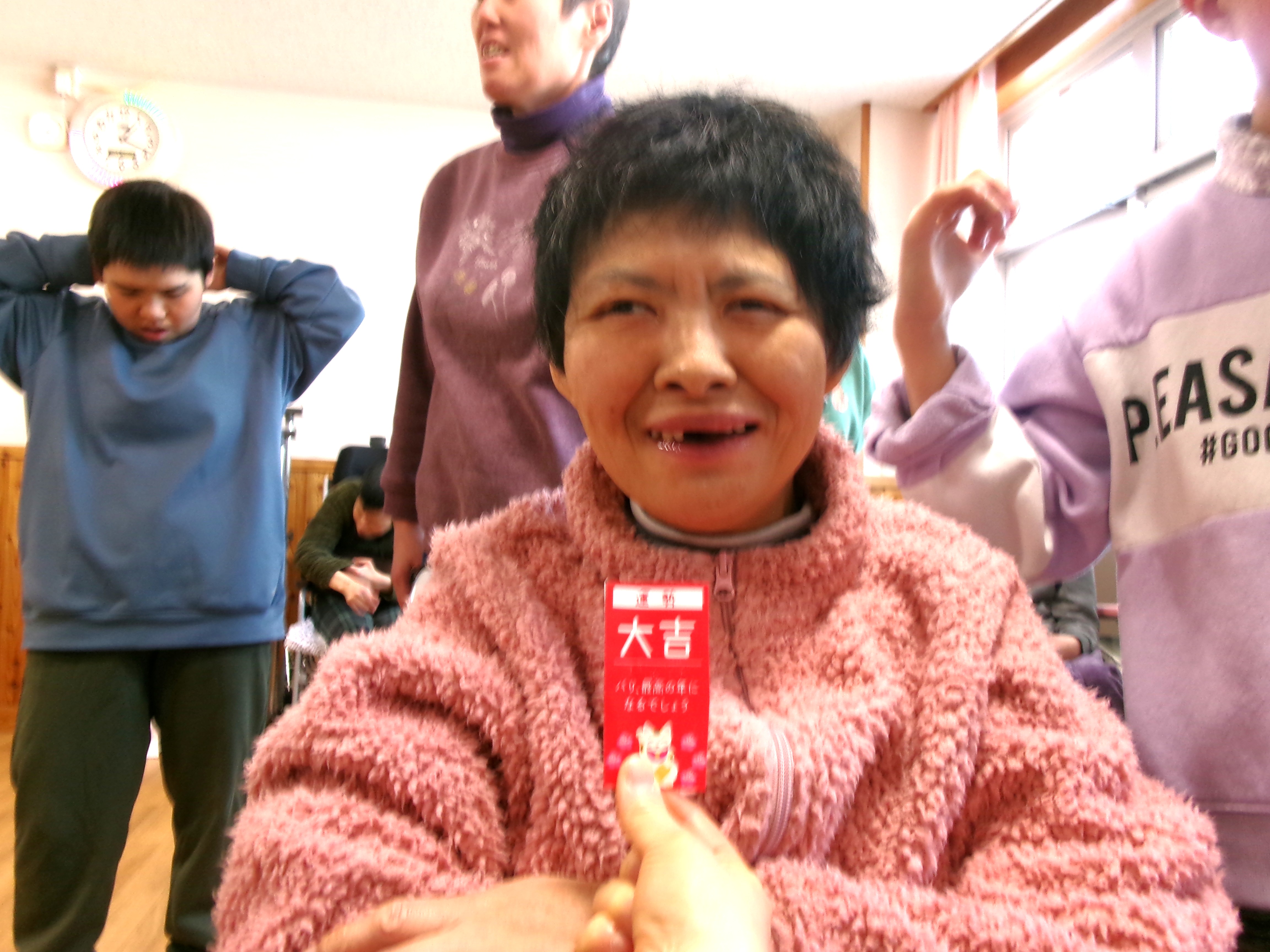 お正月の雰囲気を味わおうということで、男女それぞれの寮棟で、おみくじを引きました。全員が1枚ずつ引き、大吉から大凶まで引き当てました!