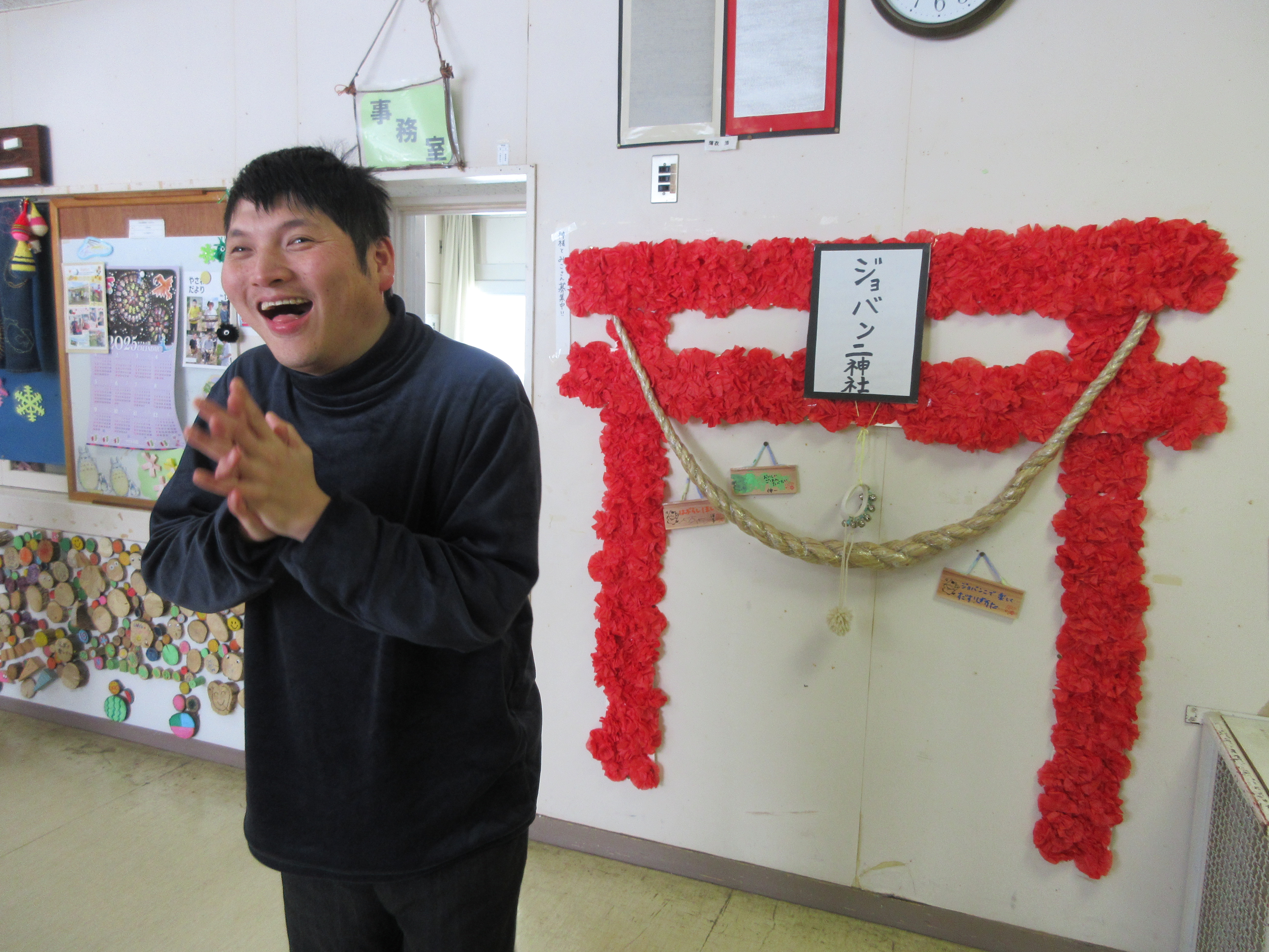 ジョバンニ神社へ初詣 2026年01月19日掲載 大きな声で元気に参拝しました! 皆さんの願いが叶いますように 事業所内に設けたジョバンニ神社で初詣を行いました。この神社も利用者の皆さんに協力いただき完成したものです。手作りの絵馬には、健康や日々の楽しみなど、色とりどりの願いが込められています。 お知らせ一覧へ