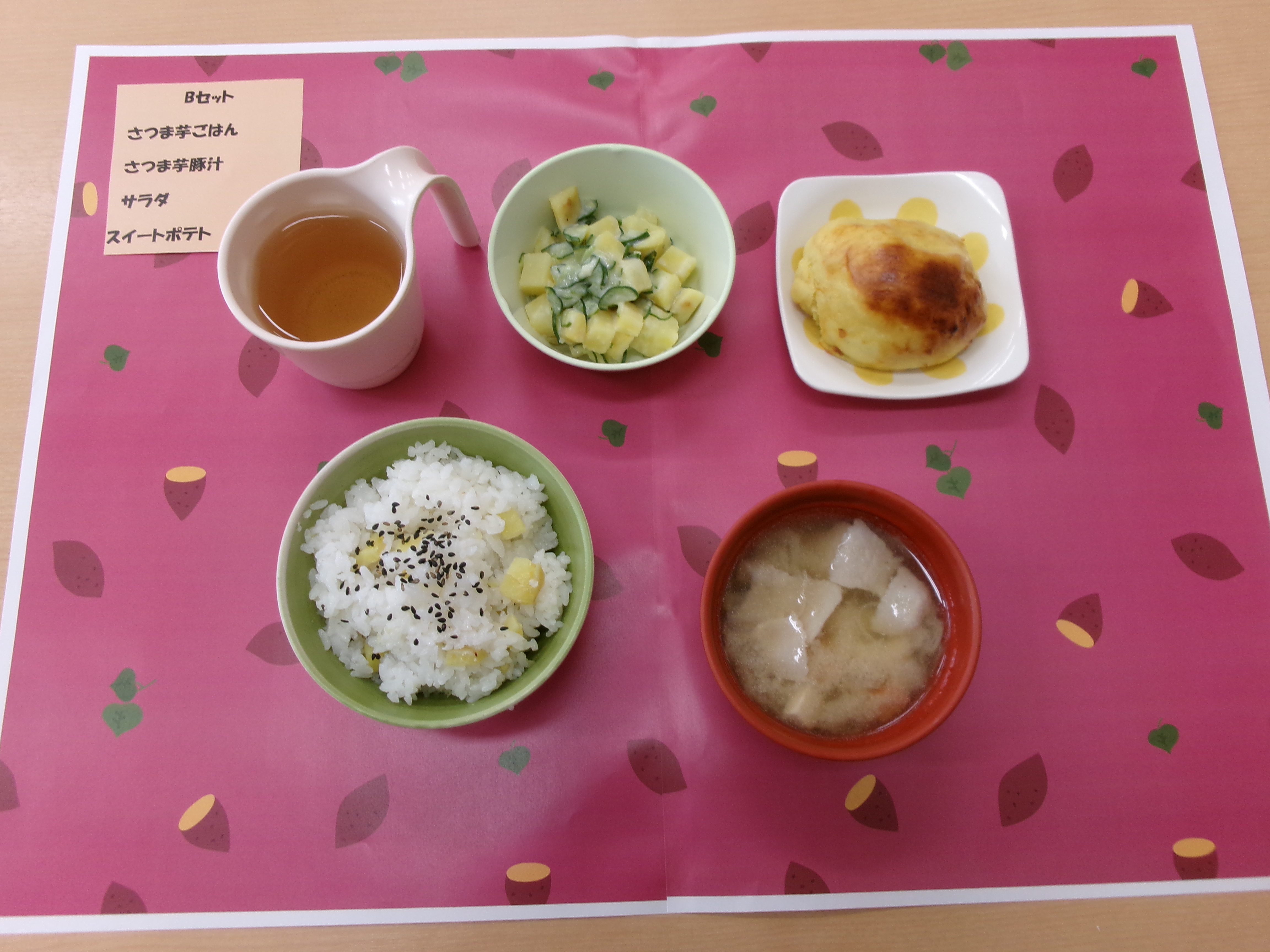 利用者の皆様はAセットの洋食風か、Bセットの和食風か、好みの方を選びました。御覧の通り、主食から汁物、サラダ、デザートに至るまでさつまいもづくしのメニューで身体に良いこと間違いなし!皆さんモリモリ食べていました♪