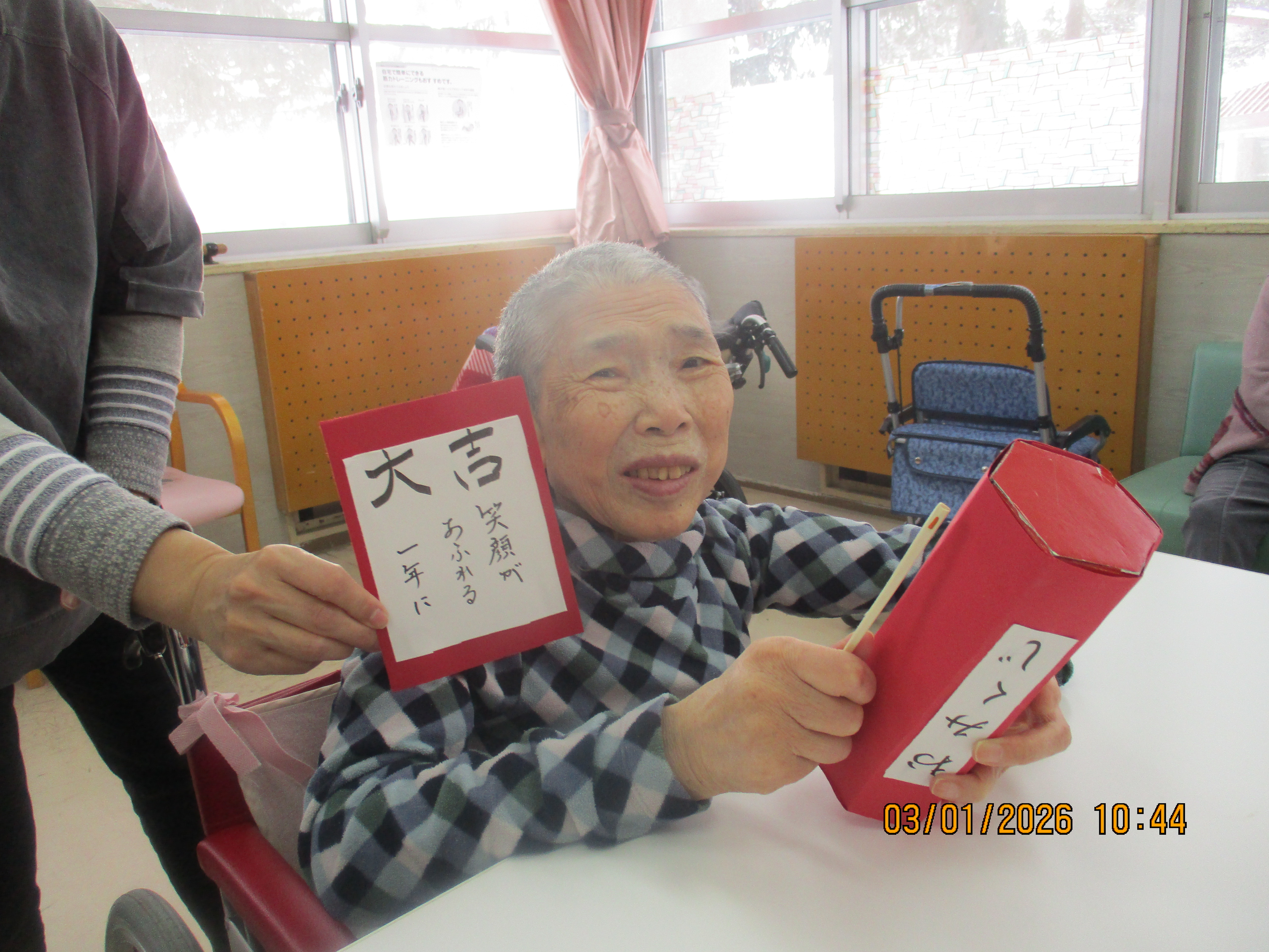 ついこの間のことのようですが、りんどうのお正月のひとときをご紹介します。「お正月といえば…」ということで「書初め」を企画。一筆一筆…緊張感を持ちながらも丁寧に気持ちを込めた書字を披露していただきました。そして、職員がお楽しみで作成した「おみくじ」で運試し✨思い思いに「運」を引き当てました。みなさま素敵な1年になりますように!(※書道作品の一部は2/3~16まで二戸地区合同庁舎「二戸地域ふくしアート展に展示します。)
