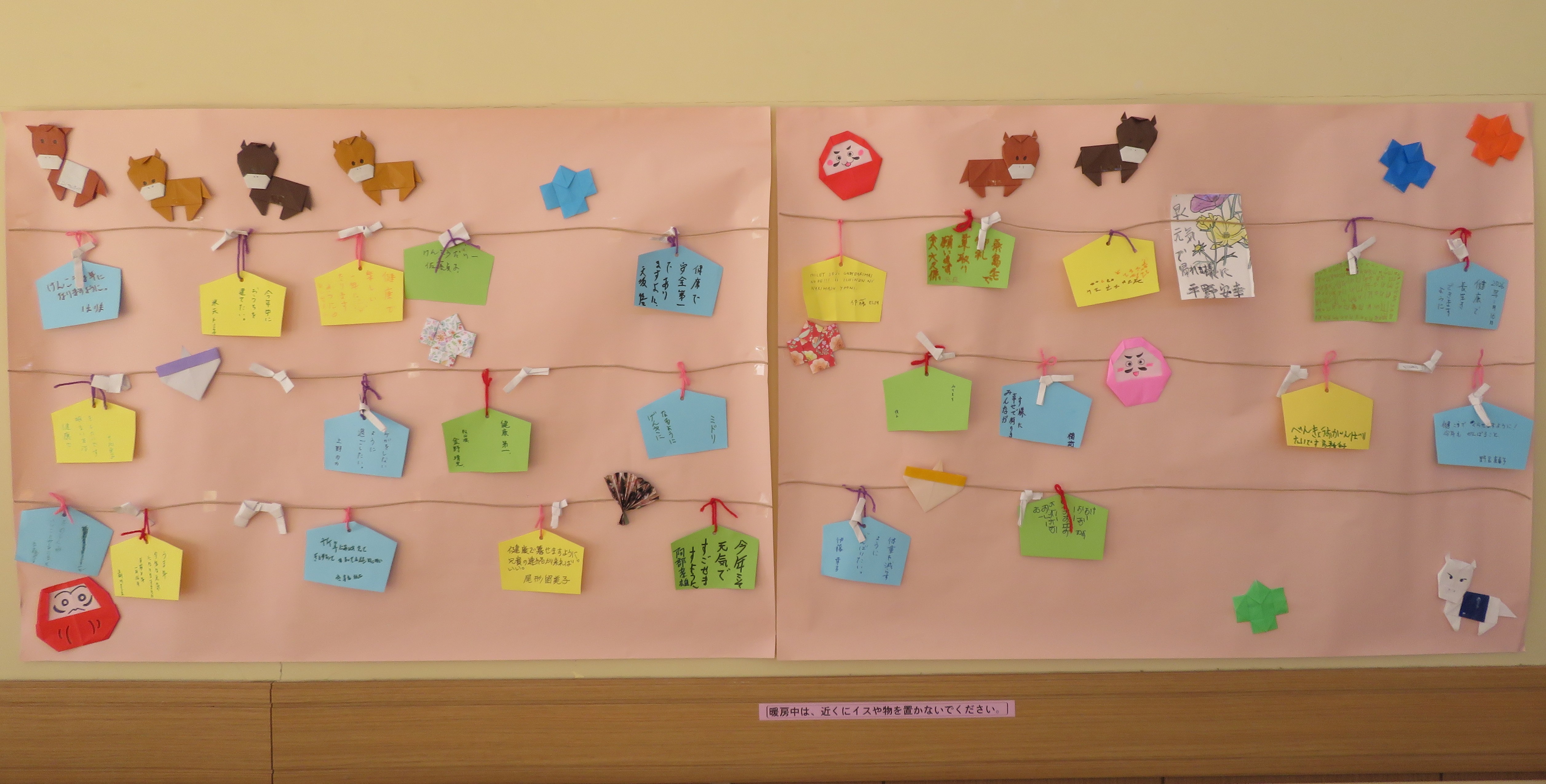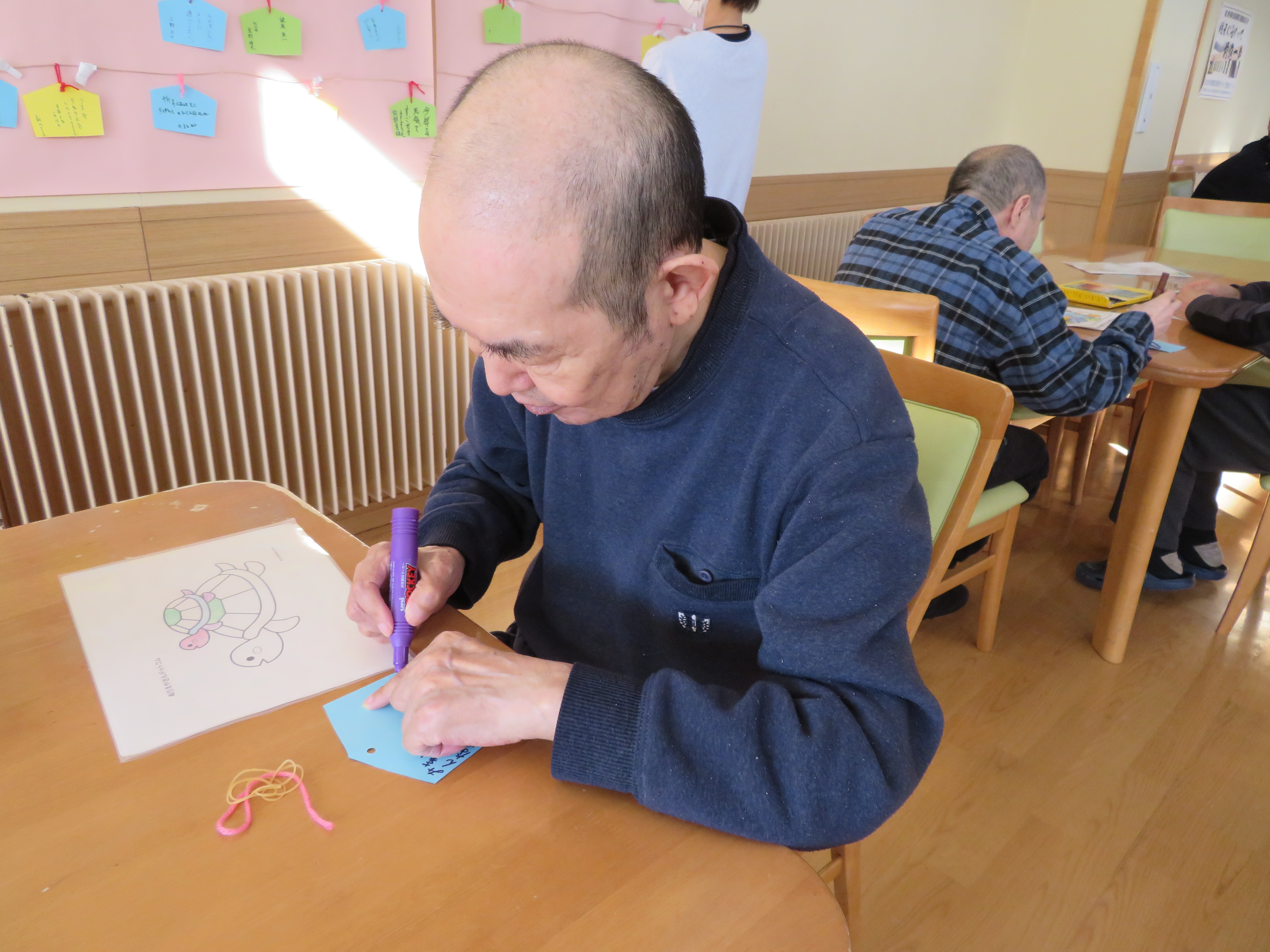 新年を迎え、当施設では日中活動の時間に、『絵馬作り』を行いました。色とりどりのペンを手に、『健康第一』など、皆様思い思いの願いを書き込まれていました。完成した個性豊かなな絵馬は食堂の壁面に飾られ、現在は施設内を明るく彩っています。皆様の願いが叶う、素晴らしい一年になることを願っています。