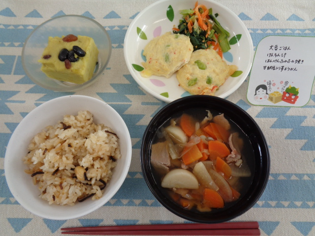 2月3日(火)は、節分メニューで「大豆ごはん」「けんちん汁」「はんぺんふわふわ焼き」「甘納豆入り芋ようかん」が提供されました👹