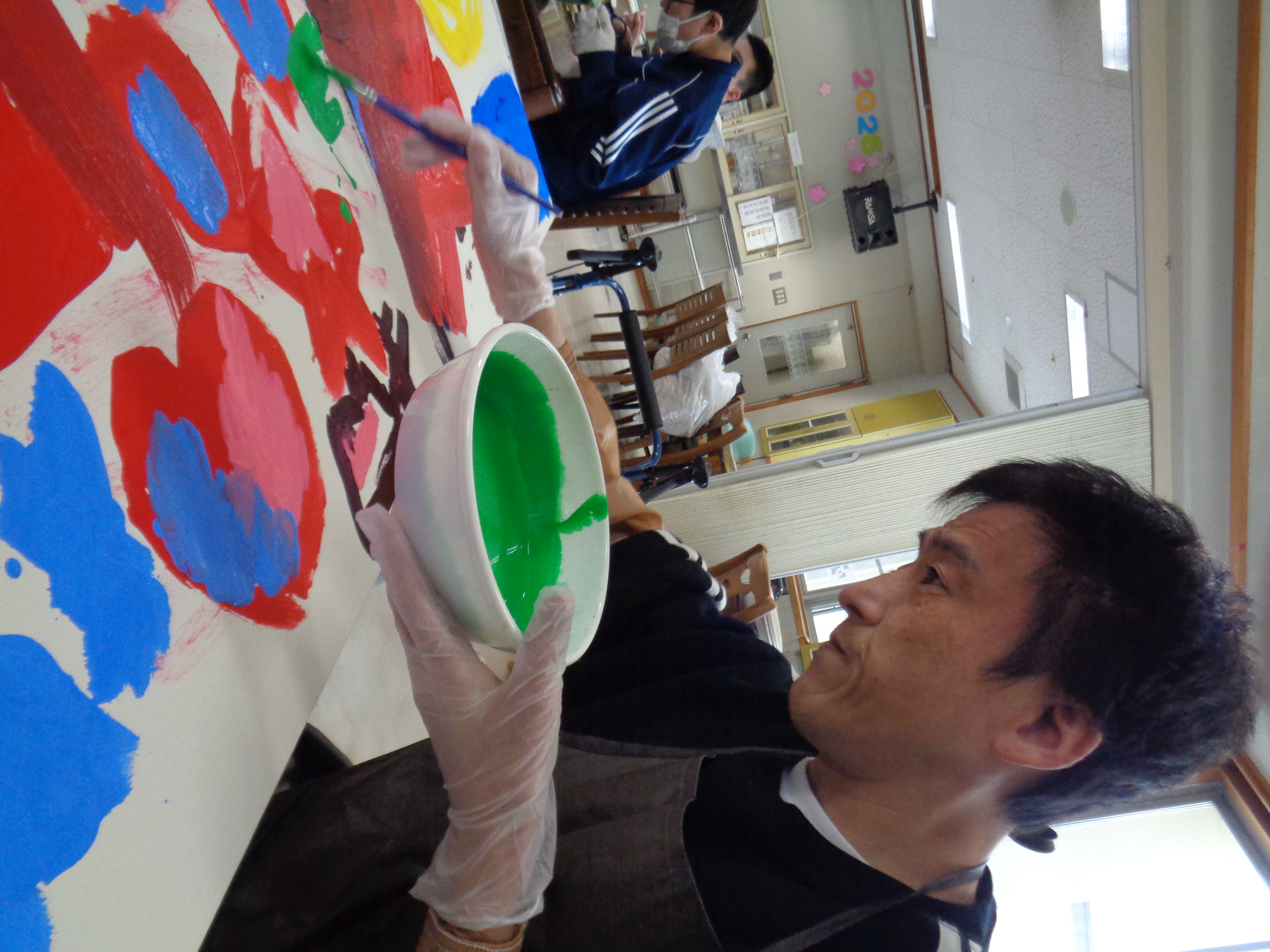 生活介護利用者のみなさんで、アート活動を行いました。大きなキャンパスに、水性絵の具を用いてテーマを決めずに自由に描いていただきました。みなさん好きな色を選び、伸び伸びと筆を動かしていました。重なり混ざりあった色でどんな作品が出来上がるか楽しみですね。