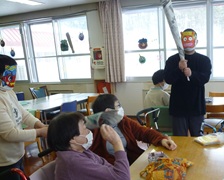利用者&職員有志で、豆まきをしました。新聞紙で鬼の金棒や豆、豆を入れるマスを作り、鬼に扮装してみんなを脅かす役と、豆を撒いて鬼をやっつける役に分かれて楽しみました。