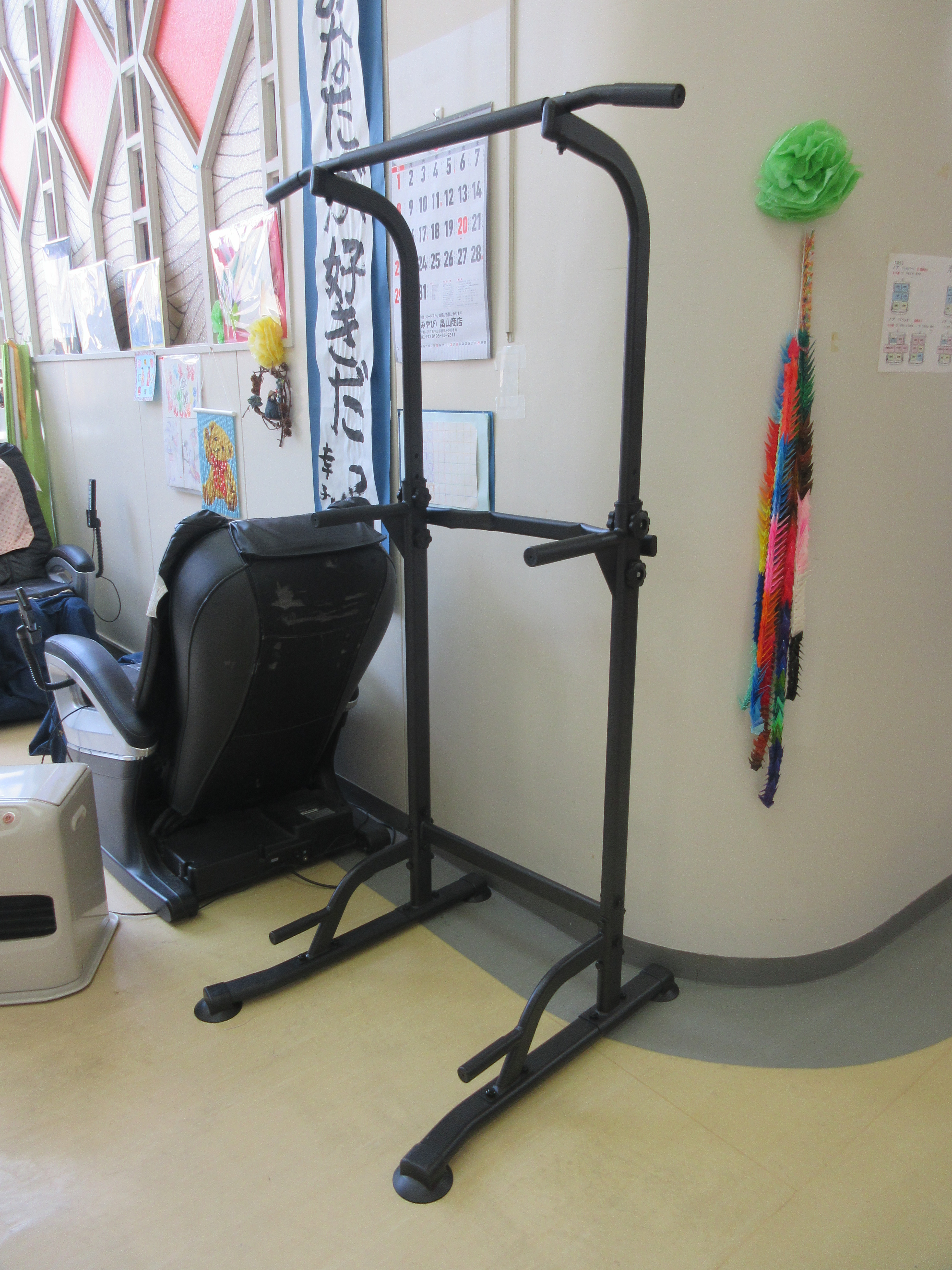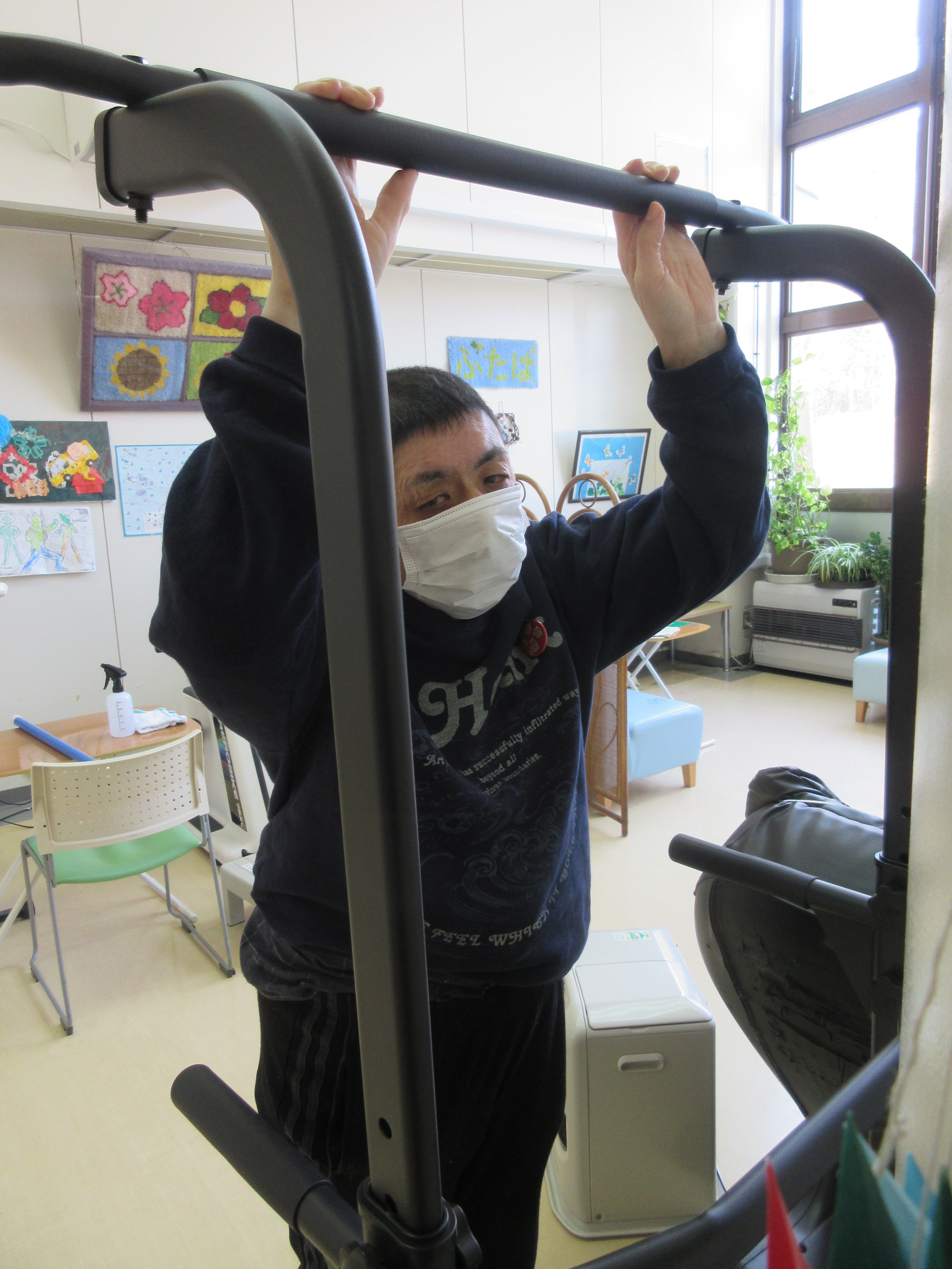 ふたばでは健康づくりに取り組んでおり、利用者さんの体力等考慮しながら、踏み台運動、エアロバイク、ルームサイクル、歩行、様々な体操等を提供しています。今回、新しく「ぶら下がり健康器」を導入しました。安全性を考え、ぶら下がらずに掴まるだけにしていますが、それでも普段伸びない部分が伸びて、気持ちいいとの感想が聞かれています。これからも様々な運動等を提供し、体力・機能維持をしていきたいと思います。