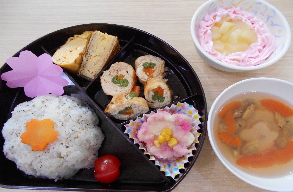 お花見弁当 2026年04月17日掲載 今日は天気も良く桜が満開です♪お花型のごはんすましじる鶏肉の肉巻き厚焼玉子桜型のポテトにでんぶ桃プリン「だれが作ったの?美味しそう!」みんな笑顔で食べていました(^^)/ お知らせ一覧へ
