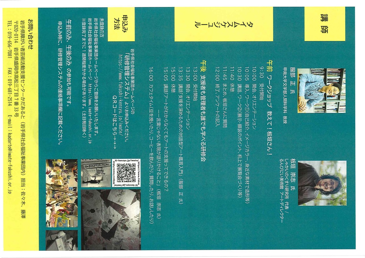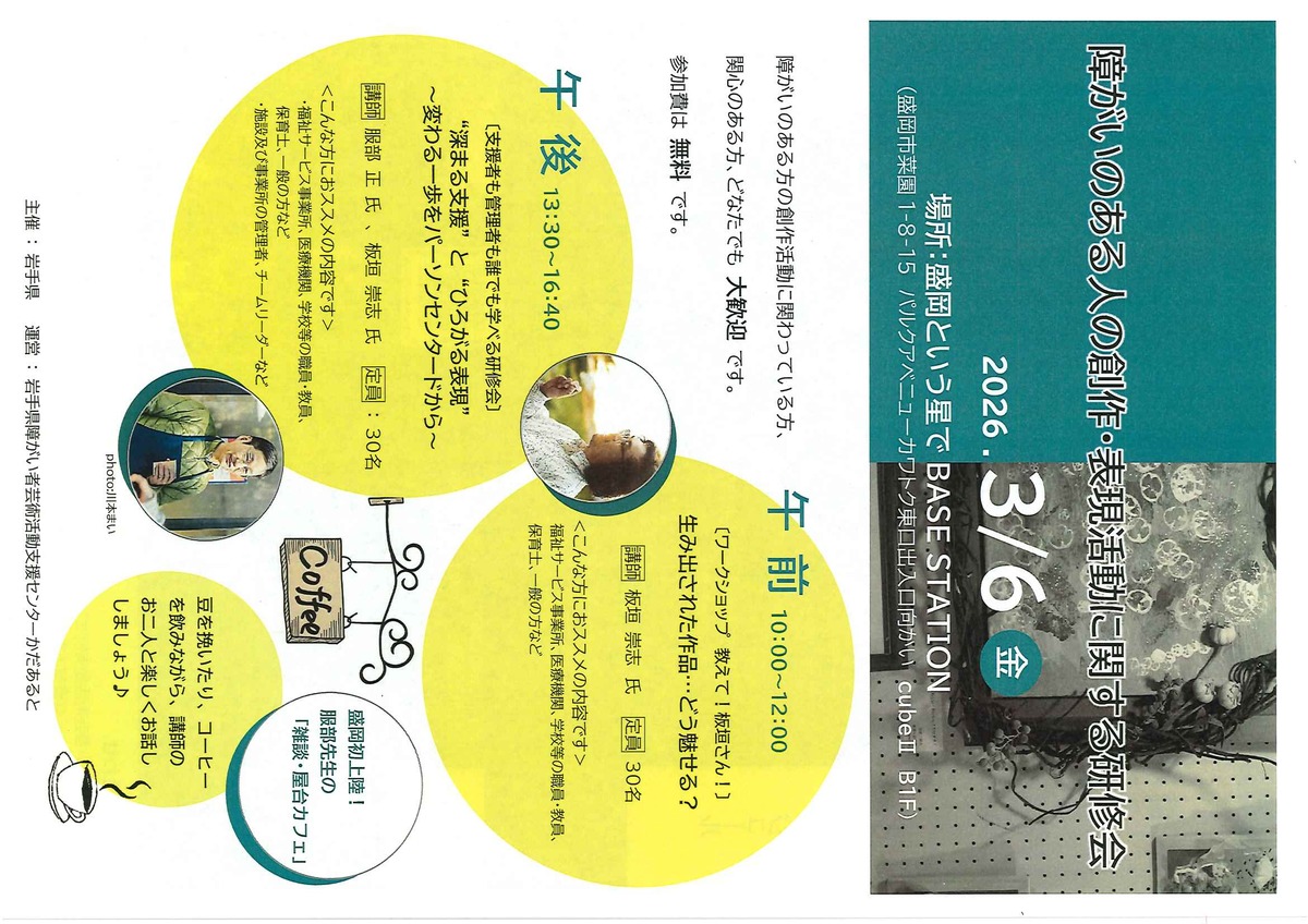 岩手県障がい者芸術活動支援センターかだあるとでは、障がいのある人の創作・表現活動に関する研修会を開催します。