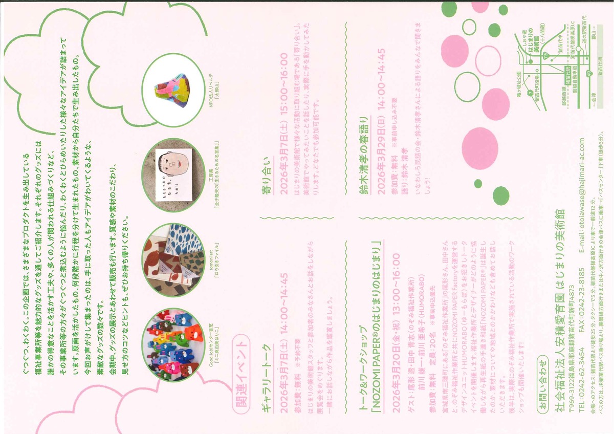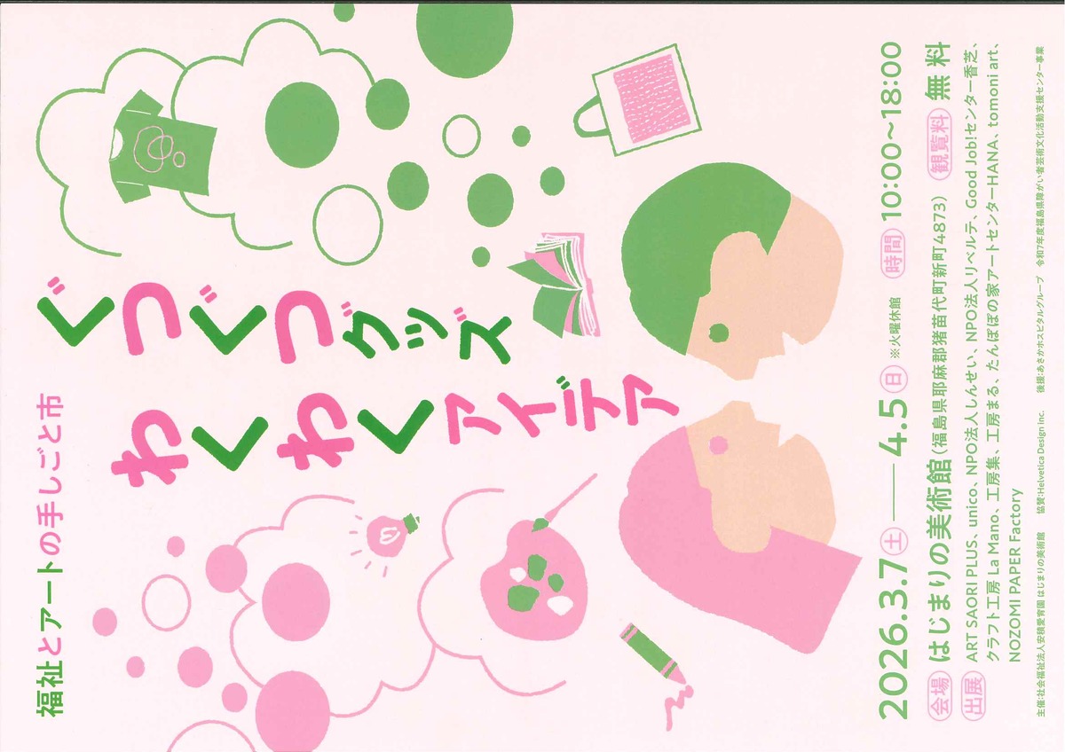 はじまりの美術館(福島県)から、福祉とアートの手しごと市「ぐつぐつグッズわくわくアイデア」開催のご案内が届きました。全国11箇所の福祉事業所やプロジェクトなどで作られている300種類以上のグッズを展示・販売する企画です。ぜひ、みなさま足を運んでみてはいかがでしょうか。詳細はチラシをご覧ください。