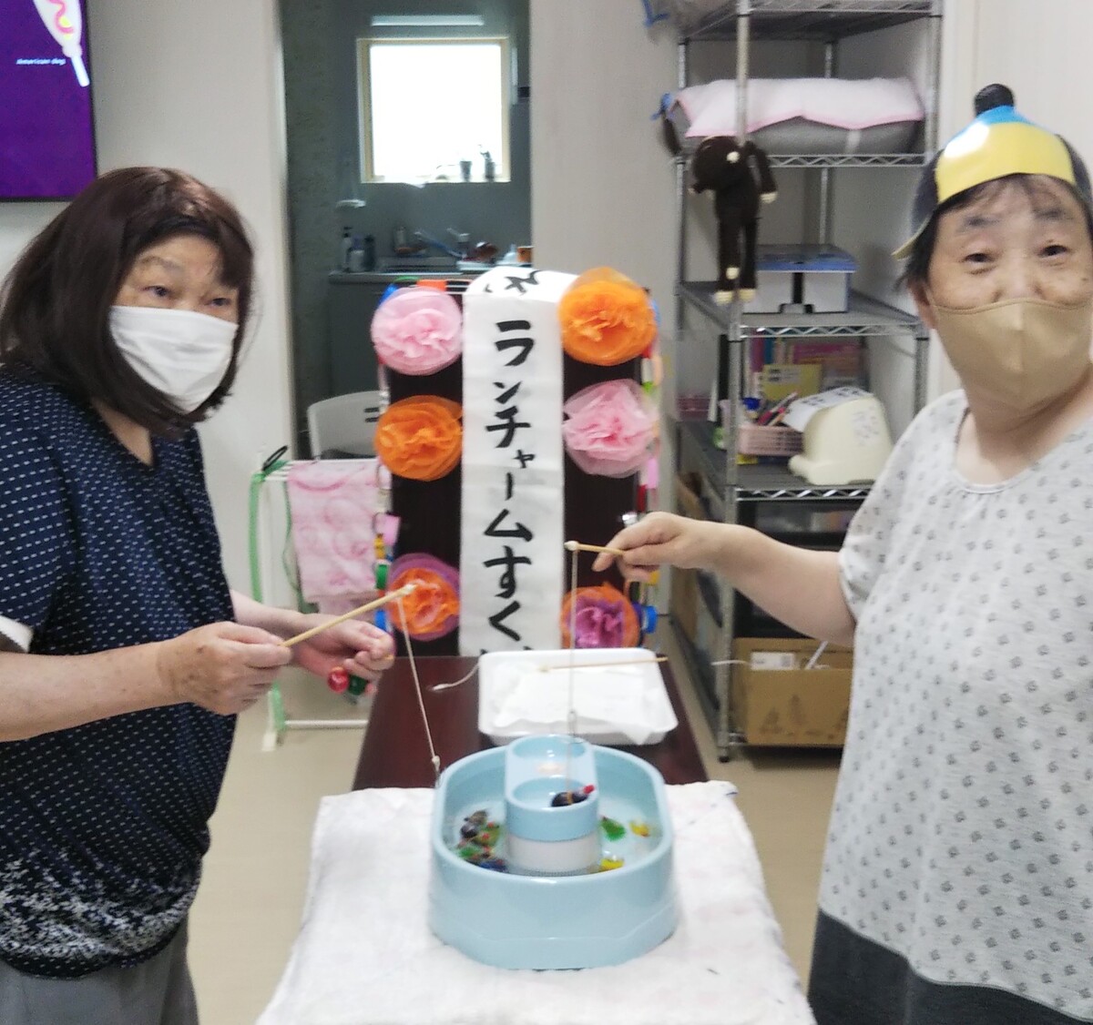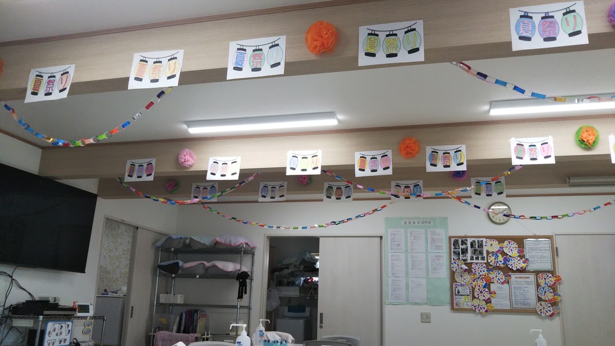 8月某日、生活介護事業所「そら」にて、小規模ながらも事業所内にて夏祭りを行いました。ゲームやカラオケなどを行い楽しいひと時を過ごしました。