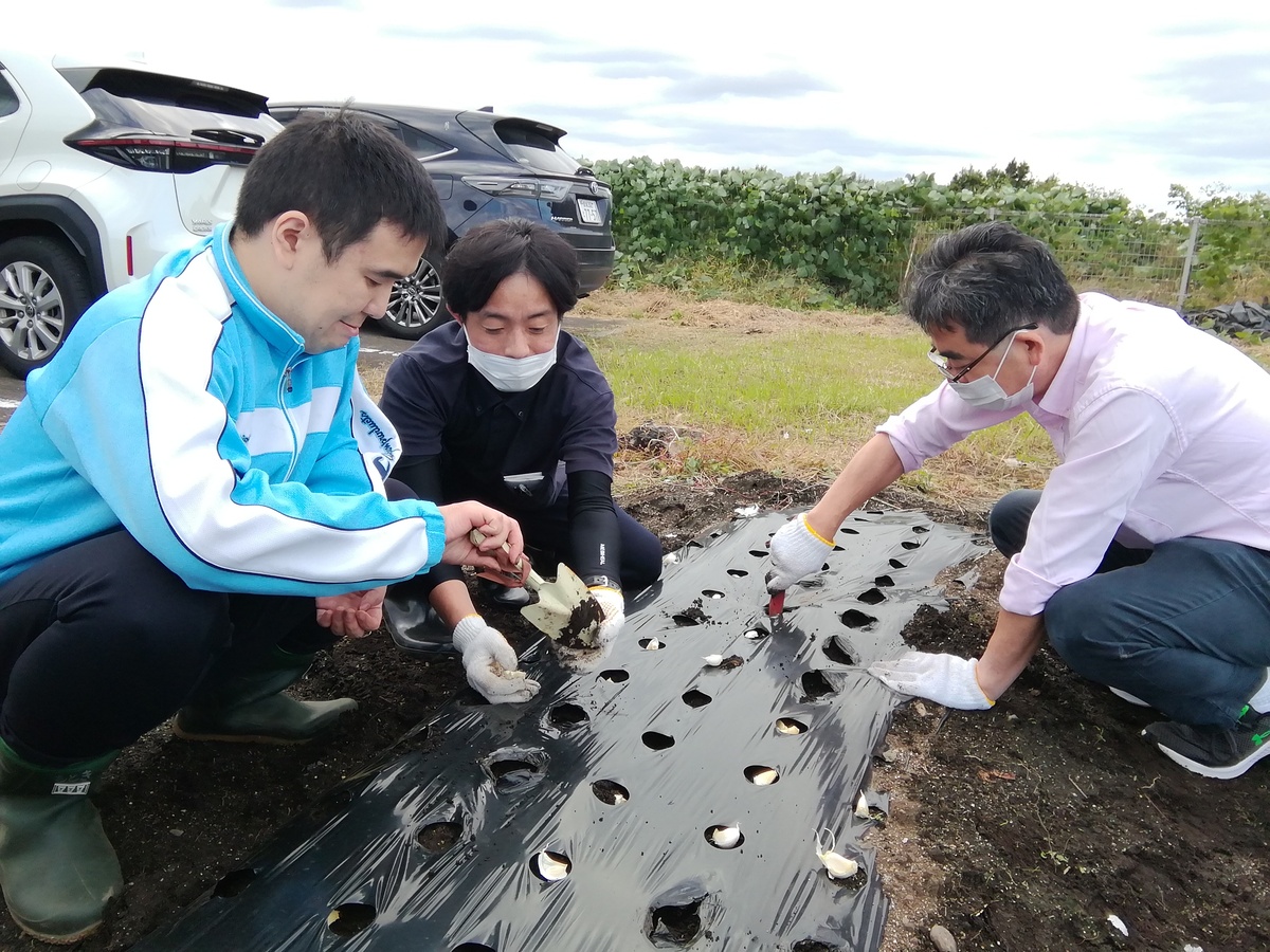 やさわ農園では冬支度をする中、次年度に向けて、にんにくの株植えを行いました。利用者有志と職員で、マルチ穴ににんにくの株を入れ、丁寧に土を被せる作業を行いました。大きく育ってくれること、今から楽しみです。