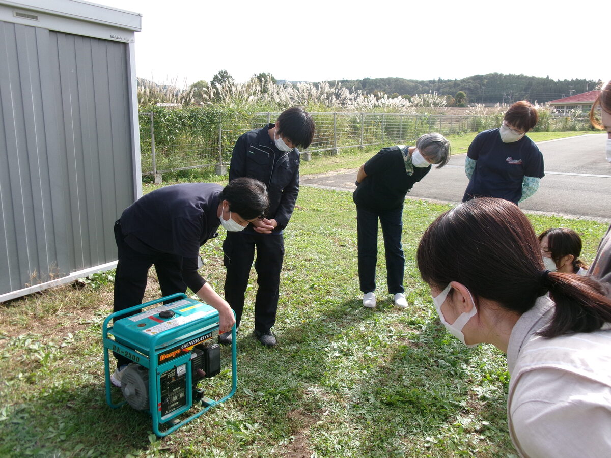 災害時、厨房が使用できない事を想定して炊き出し訓練を行いました。まずは防災係から発電機の使用方法を学び、実際に動かしてみました。
