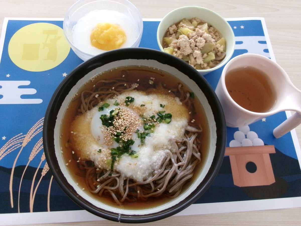 今年の十五夜メニューは、月見そばでした。とろろの上に温泉卵が乗っていて、食べやすかったのか、みなさんペロリと食べていました。 デザートはミルク寒天で、黄桃缶で綺麗な満月を表しました🌝