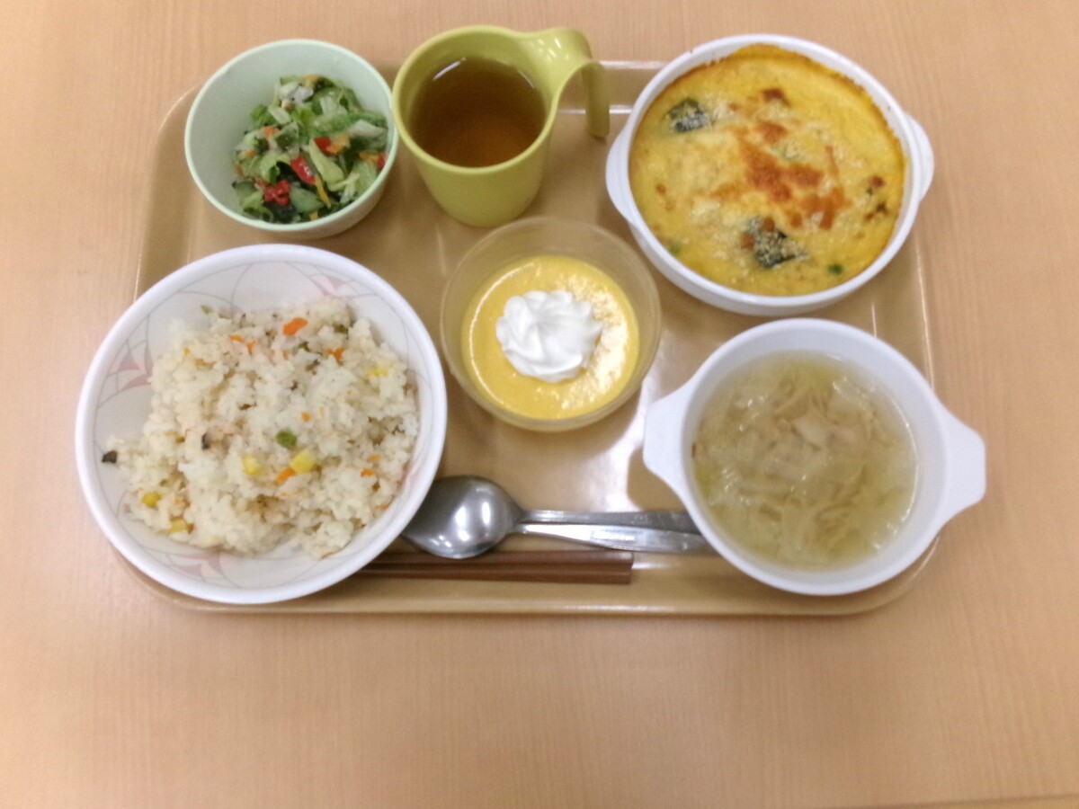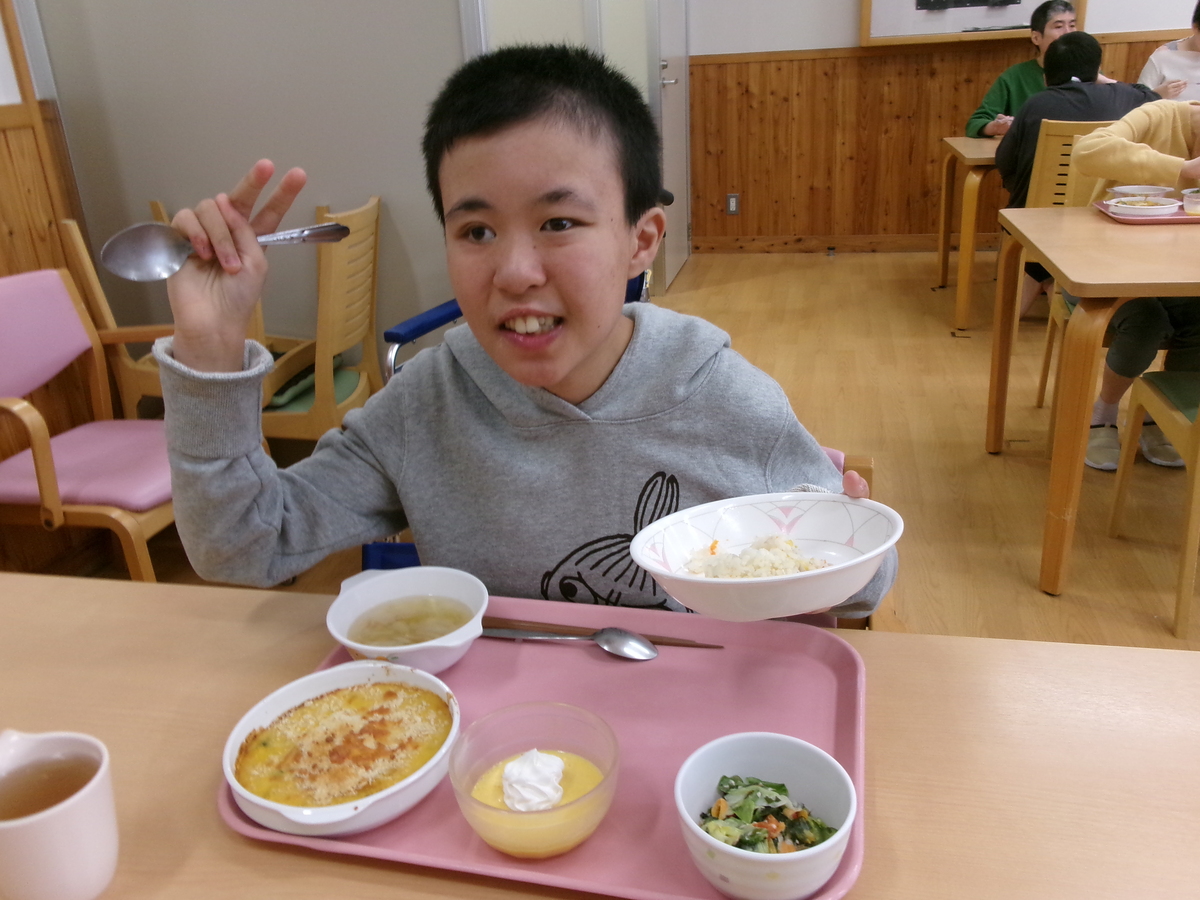 今年のハロウィンメニューは、ピラフにチーズたっぷりのかぼちゃグラタンにホイップクリームたっぷりのかぼちゃプリンと、皆さん大好物の物ばかりでした! 秋を感じるかぼちゃの温かいグラタンで体も温まりましたね!
