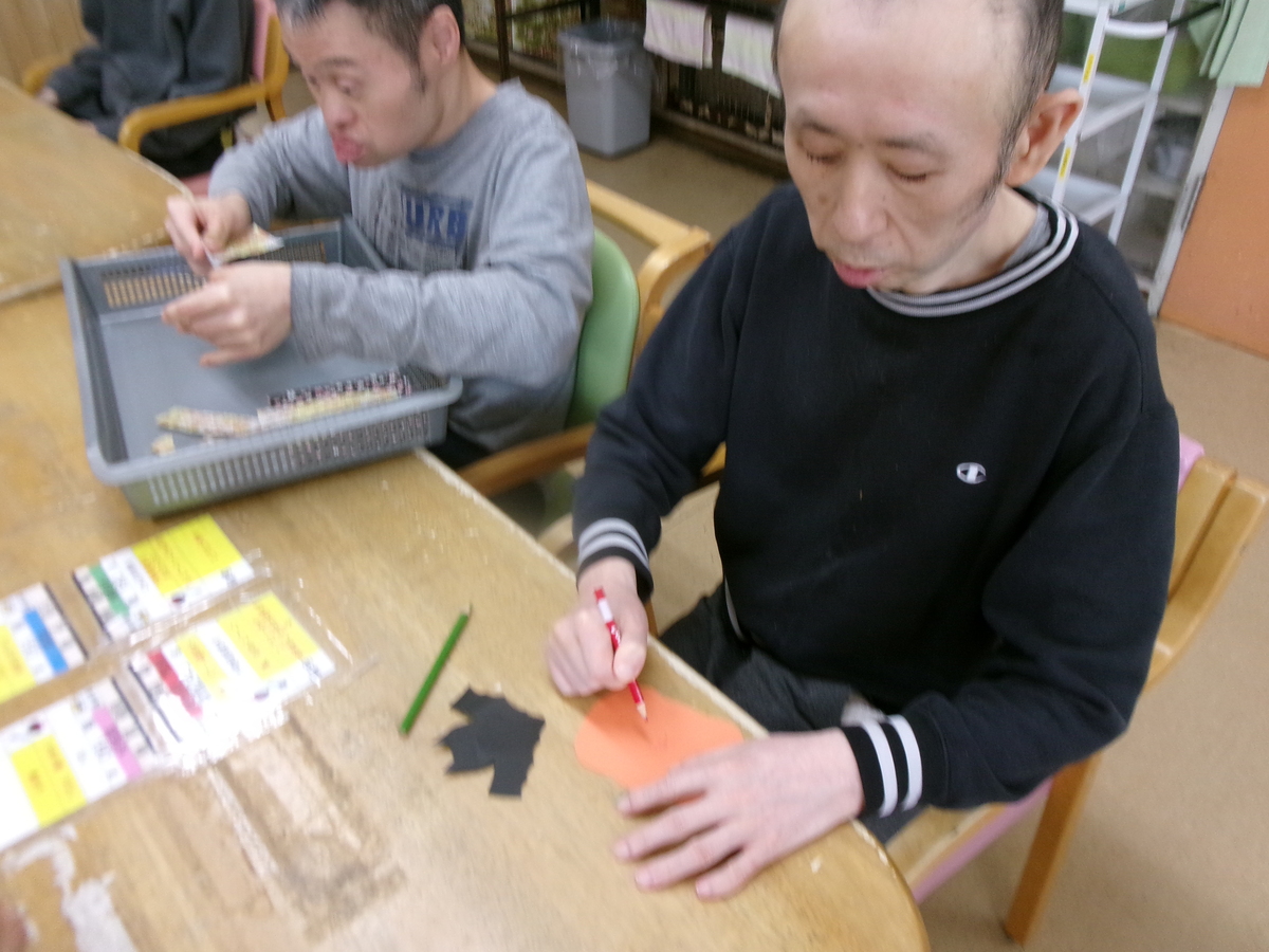 ハロウィン会で使用する飾りを製作しました!好きな色で模様を描いたり、シールを貼り付け、素敵な作品ばかりです!作品は食堂内に飾り付け、一気に食堂が秋らしい装いになりました!この後開催されるハロウィン会を楽しみたいと思います!