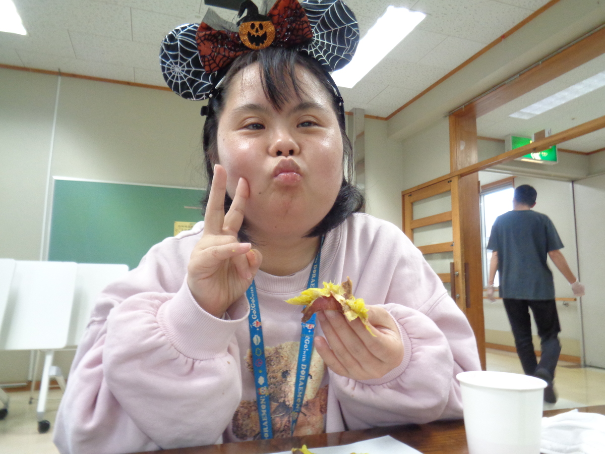 実りの秋、食欲の秋ということで、皆さん楽しみにしていた収穫祭。9月に収穫したさつまいもをいただきました。夏の間、利用者の皆さんが水やりや草取りを手伝っていただいたおかげで大きく立派に育ったさつまいも、と~っても甘いやきいもになりました!一口頬張りおいしさに思わず笑顔、ハロウィンの季節感も感じながら、楽しいひと時を過ごした皆さんでした。