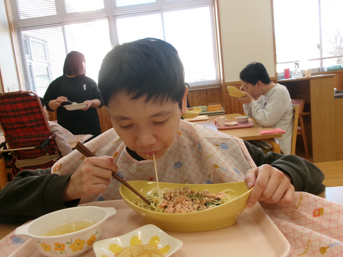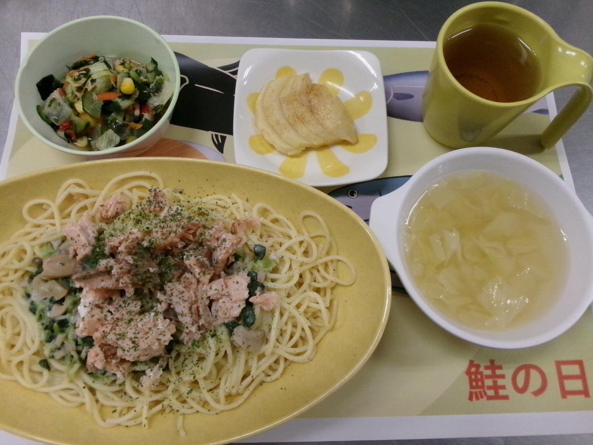 11月11日は鮭の日!昼食はほぐした鮭がたっぷり乗ったクリームパスタでした♪上の具材から食べる人、よく混ぜて食べる人、様々でしたが、みなさん残さず完食しました!