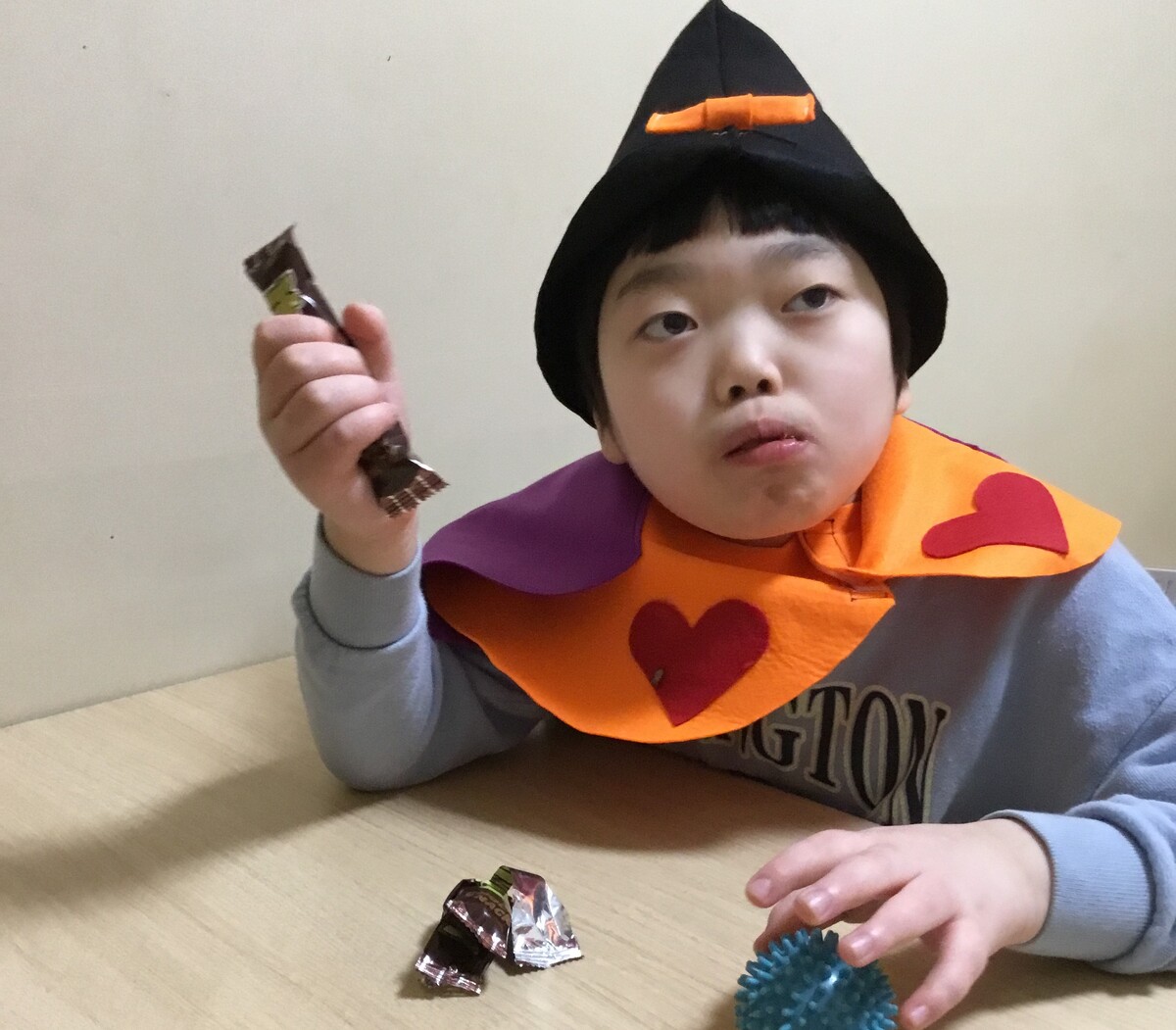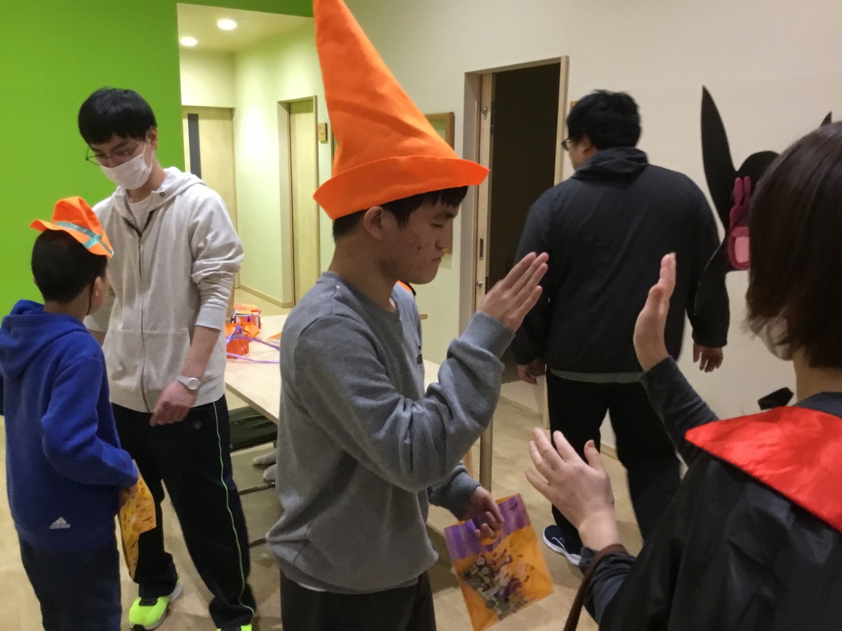 10月31日に施設内でハロウィンを行いました。仮装をして職員からおやつをもらい、みんな大はしゃぎでした😊
