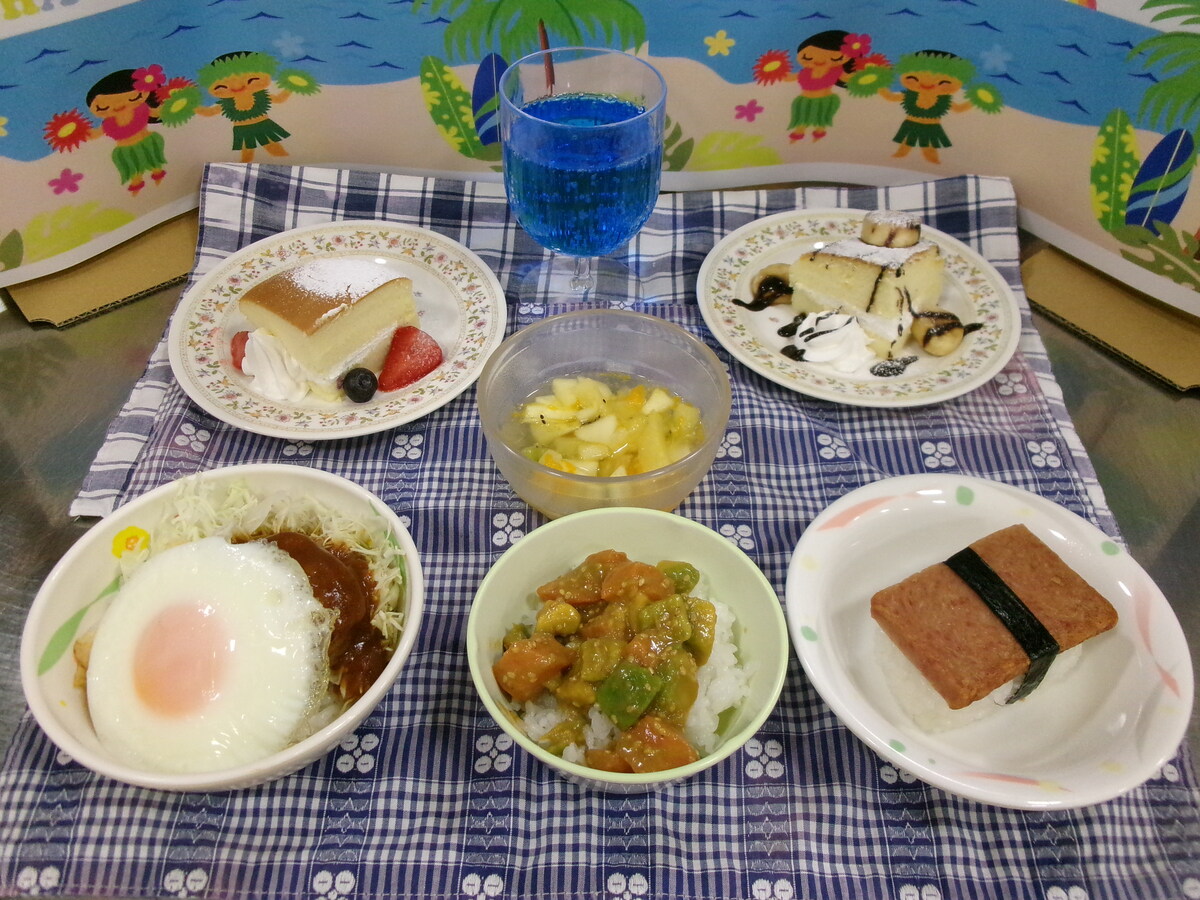 11月25日の昼食は、男子寮希望のハワイバイキングでした!おしゃれな丼物に、果物や生クリームをたくさんトッピングしたパンケーキ2種、シュワシュワッと爽やかなフルーツポンチ、飲み物はブルーハワイとメロンハワイで、身も心も常夏のハワイを味わいました!