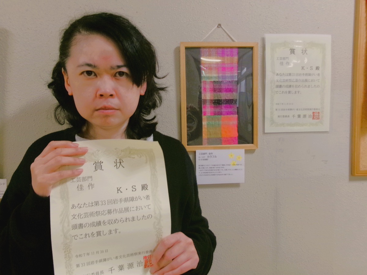 第33回 岩手県障がい者文化芸術祭の応募作品展が、盛岡市のふれあいランド岩手にて11月13日~12月7日の期間で行われました。 当園利用者さまからも多数の応募をいただき、出展することができました。その中で2名の利用者さまの作品が書道部門、工芸部門にて「佳作」に入選されましたので、ご紹介します! 入賞された2名のみならず、応募いただいた全ての利用者さまが、活動時間や余暇時間等を使い、熱心に作品作りに励んでいました😊