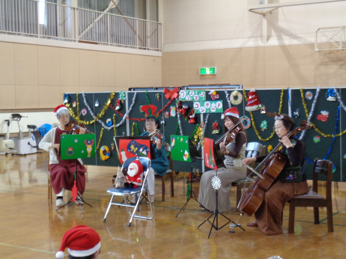 12月18日(木)、松風園体育館にて「クリスマスコンサート」が開催されました。 今回は、「よまえまカルテット」の4名の方にご来園いただき、演奏していただきました🎻🎶 コンサートでは、クリスマスらしい曲目から懐かしのあの曲まで、たくさんの曲を演奏いただきました!利用者の皆さまも歌ったり踊ったりと思い思いに楽しむ様子がみられました🥰 カワイイ装飾や被り物と素敵な演奏で、一足先にクリスマス気分を味わいました🎄🎁