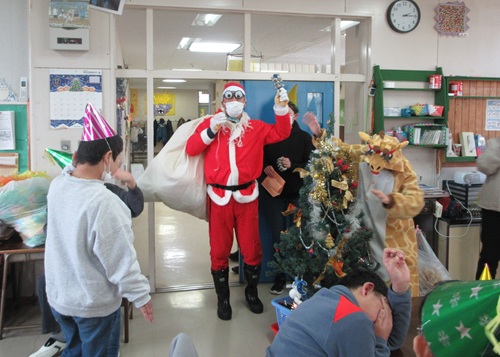 この日のハッピーフライデーではクリスマス会を行いました。ジングルベルの曲に合わせて歌とダンスを楽しんだ後は、サンタクロースとトナカイが登場!ハーモニカを吹きながらの登場に会場は大いに沸きました。最後はケーキとジュースで乾杯し、皆さんにっこり笑顔で食べていました。
