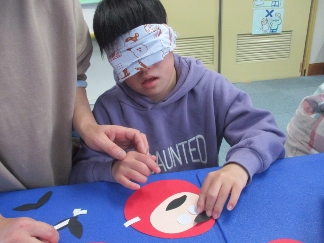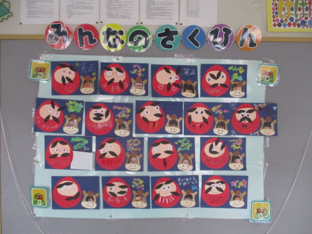 1月の壁面装飾は、だるまです!お正月らしい遊びを取り入れ、目隠しをして福笑いを行いながらだるまのまゆげ、目、髭のパーツを貼り付けました。「見えないよ~」と言いながらも職員からの声掛けを頼りに、それぞれが愛らしい個性あふれる顔のだるまを完成させました。“笑う門には福来る~♪”素敵な一年になりますように…♡