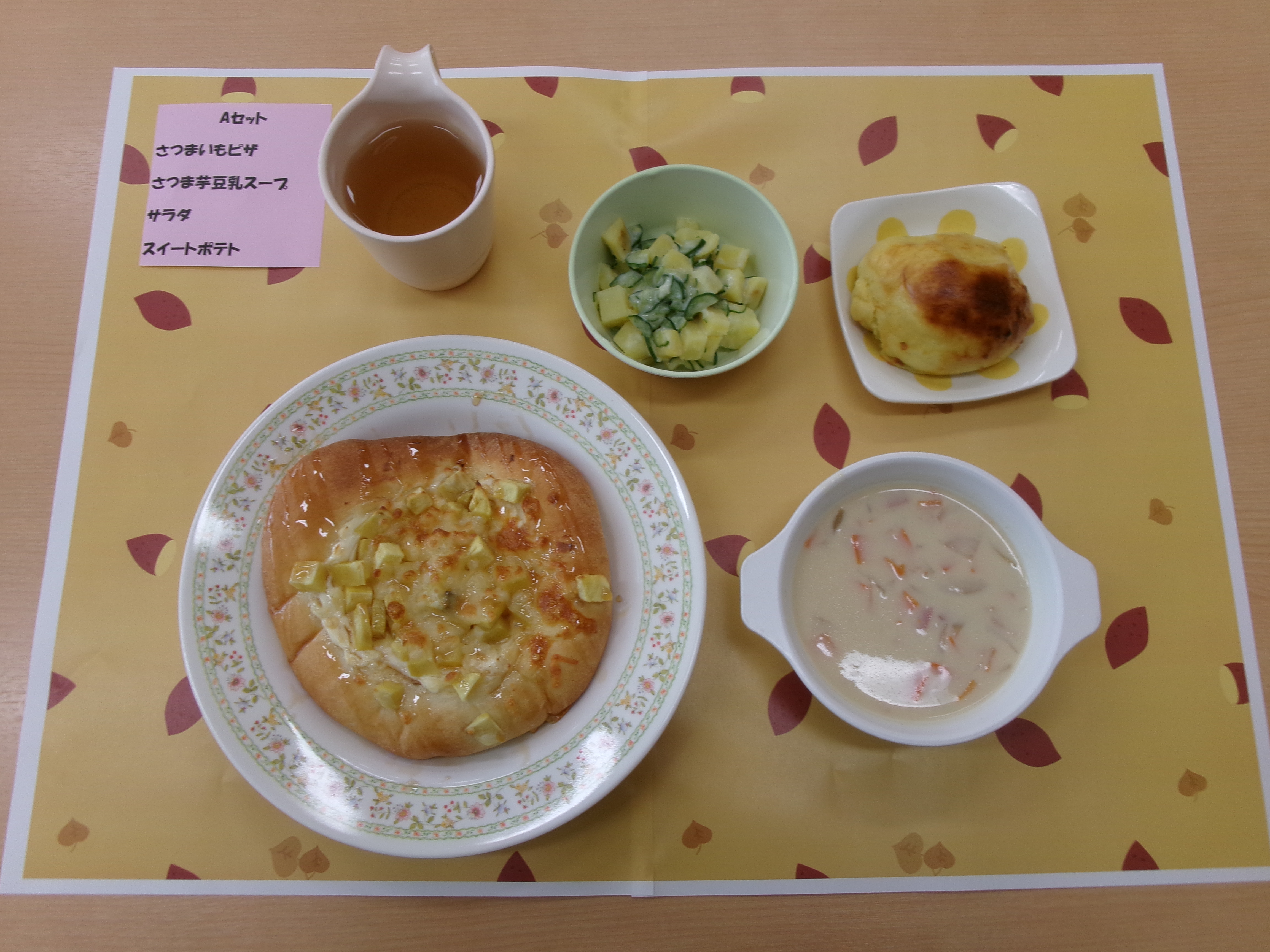利用者の皆様はAセットの洋食風か、Bセットの和食風か、好みの方を選びました。御覧の通り、主食から汁物、サラダ、デザートに至るまでさつまいもづくしのメニューで身体に良いこと間違いなし!皆さんモリモリ食べていました♪