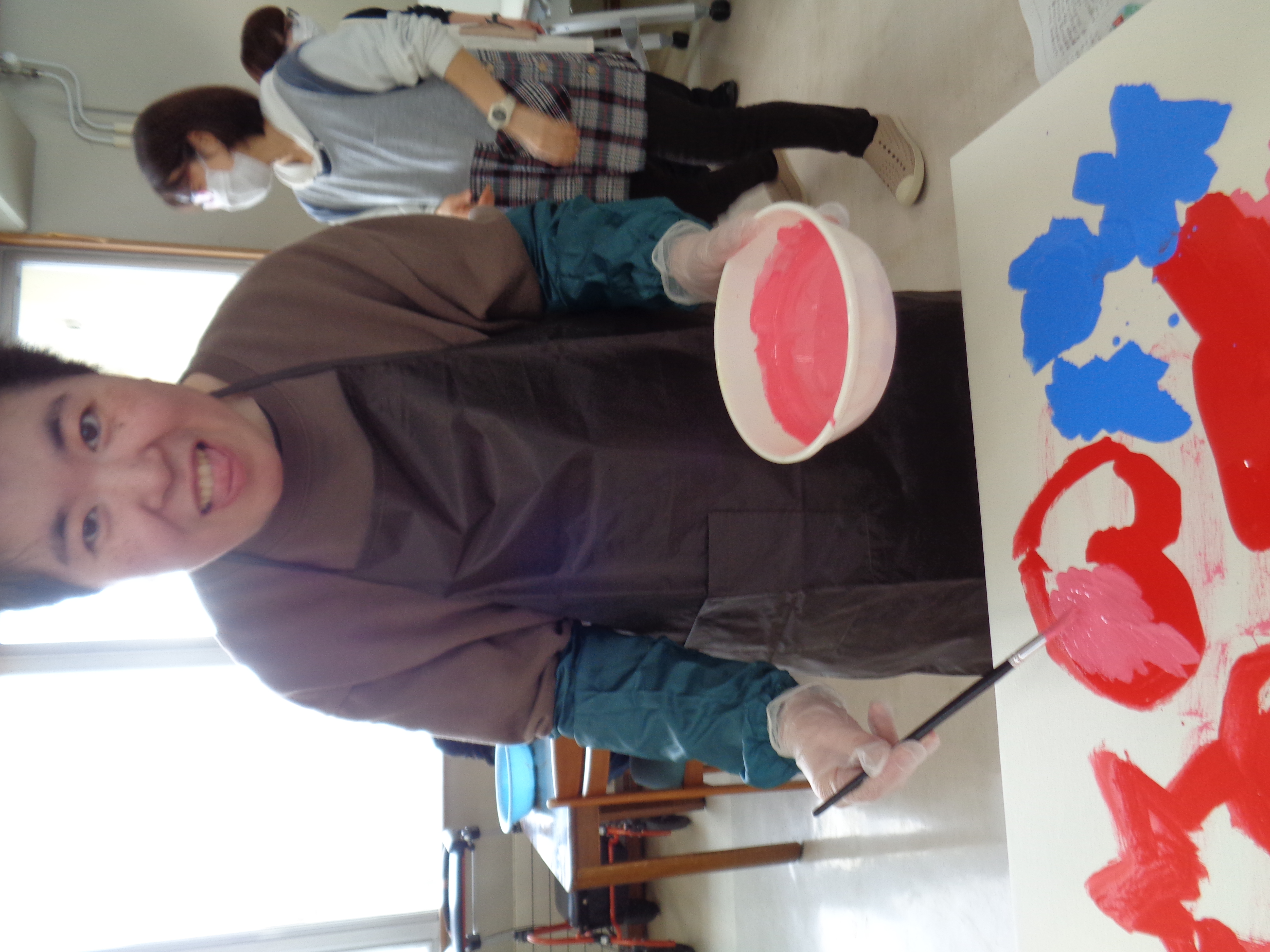 生活介護利用者のみなさんで、アート活動を行いました。大きなキャンパスに、水性絵の具を用いてテーマを決めずに自由に描いていただきました。みなさん好きな色を選び、伸び伸びと筆を動かしていました。重なり混ざりあった色でどんな作品が出来上がるか楽しみですね。