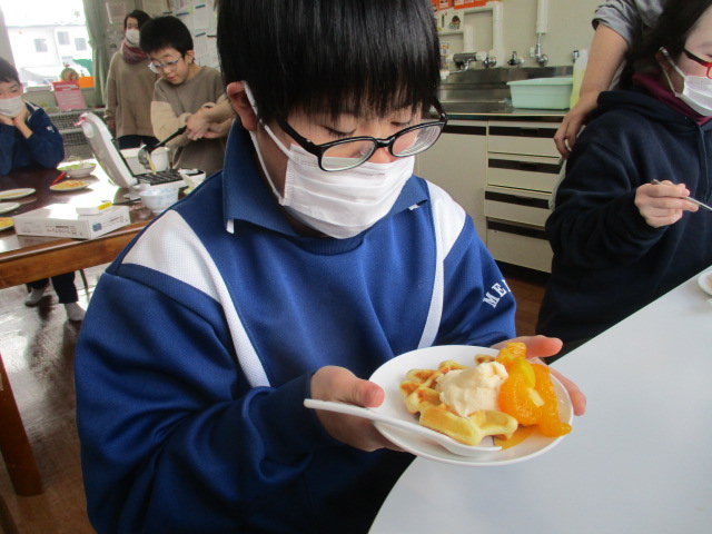 1月の手作りおやつは、ワッフルでした。ホットケーキの生地を順番で混ぜてもらい「美味しく出来上がりますように」と気持ちを込めてワッフルメーカーに流し入れました。出来上がったワッフルにたくさんのフルーツとアイスクリームをトッピングして完成!みんな口いっぱいに頬張りました♬