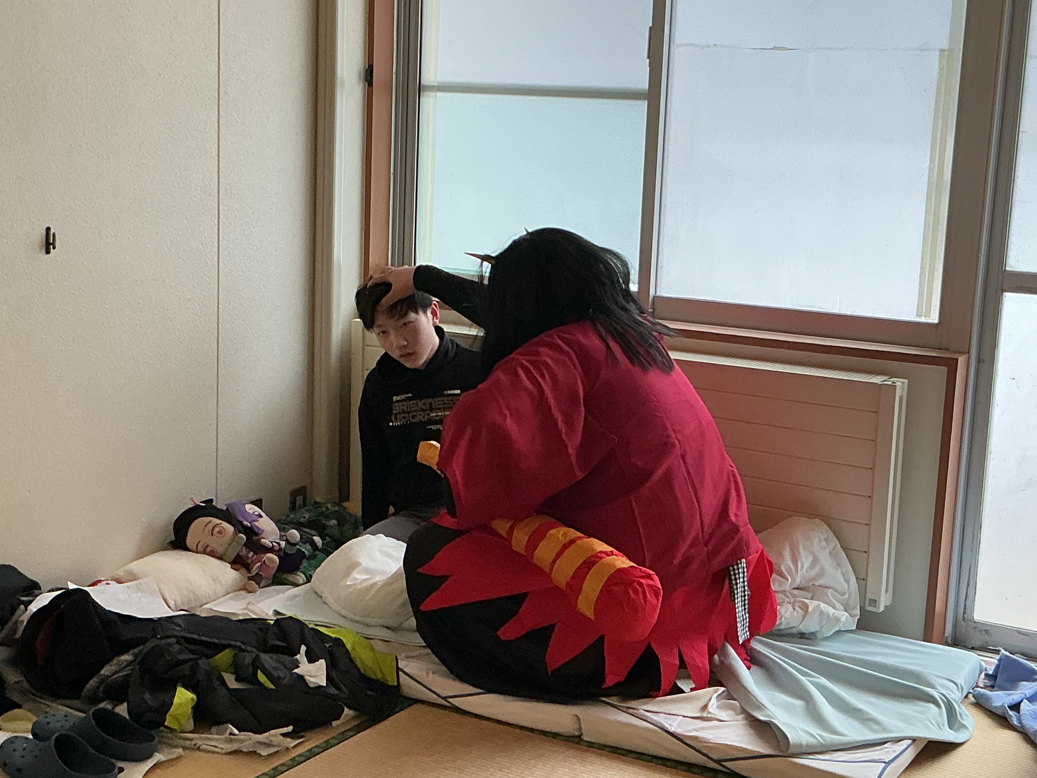 鬼は外!福は内! 2026年03月01日掲載 たすけて~!! いい子にします・・ 2月3日、節分。学園ではそれぞれの寮棟に赤鬼が登場しました。泣いて怖がる児童、笑いながら立ち向かう児童、豆を投げて鬼を追い払う児童、様々でした。自分の中の悪い鬼も、退治できたでしょうか・・? お知らせ一覧へ
