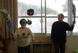利用者&職員有志で、豆まきをしました。新聞紙で鬼の金棒や豆、豆を入れるマスを作り、鬼に扮装してみんなを脅かす役と、豆を撒いて鬼をやっつける役に分かれて楽しみました。